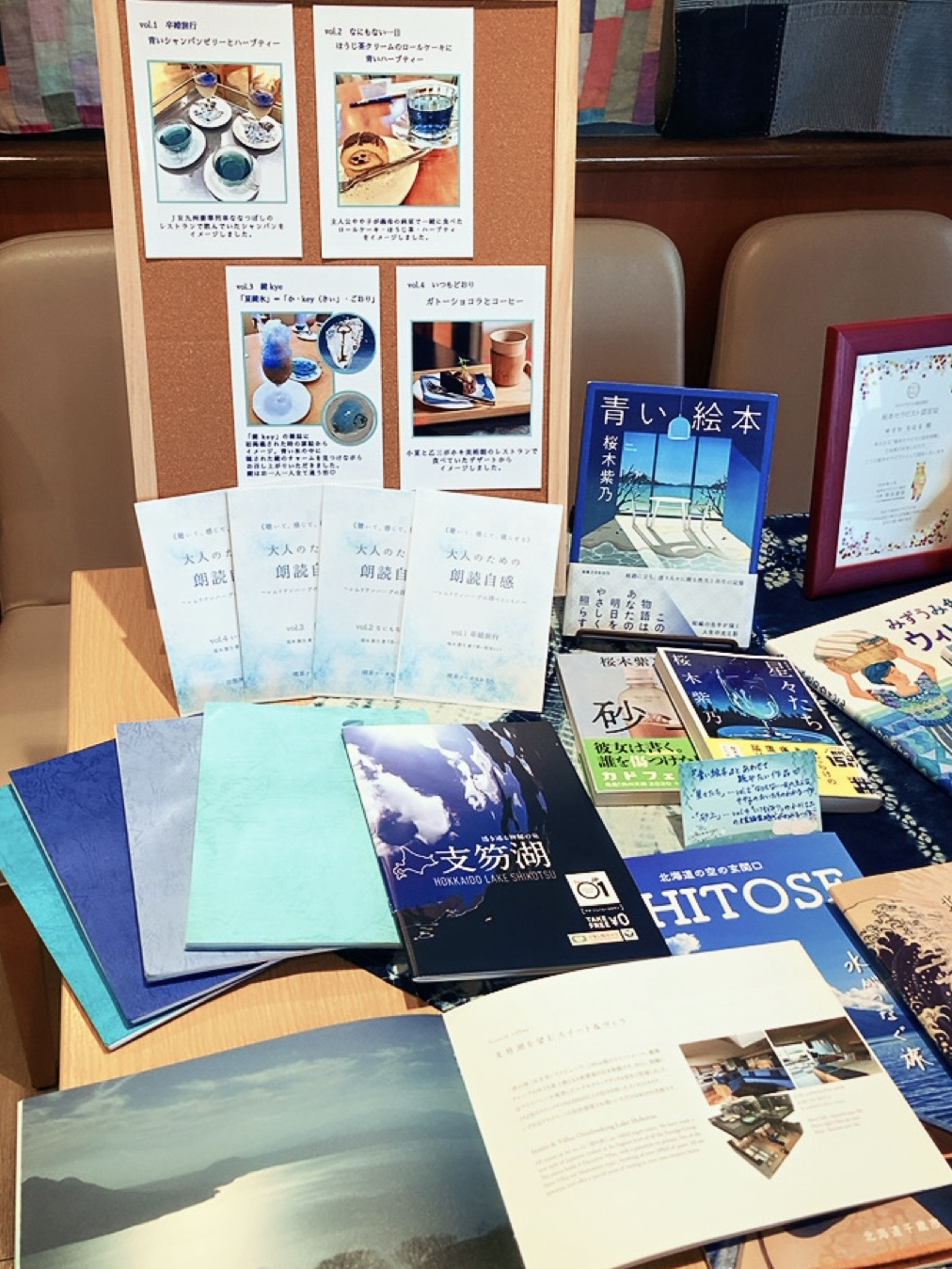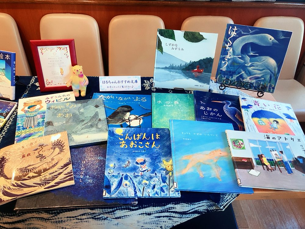 絵本コーナーには今回も朗読のテーマに合わせた絵本を飾らせていただき、(「青」が印象的な作品を揃えました♡)