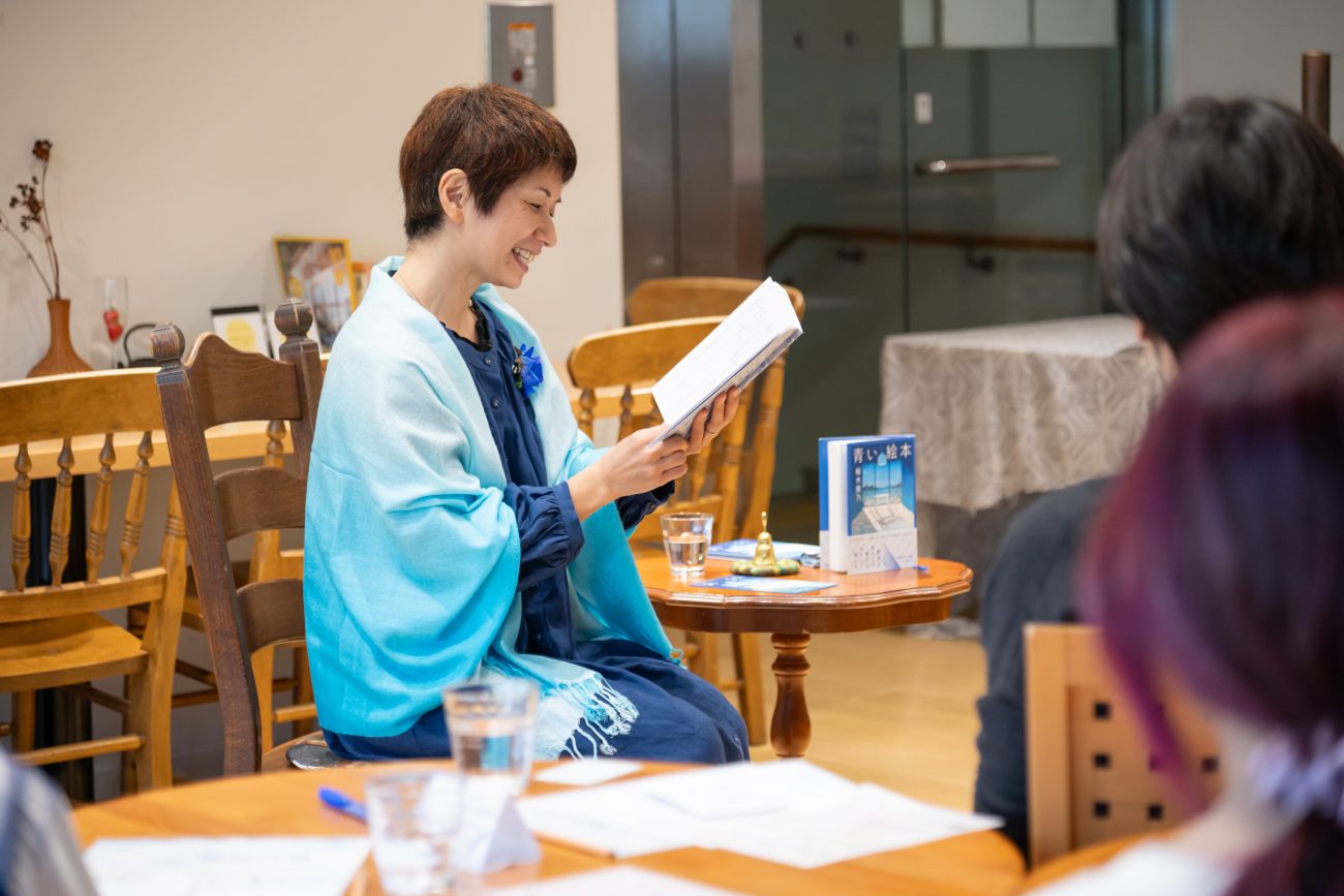 スイーツを頂きながら、テーブルごとに皆様それぞれに思い出の”青い風景”を伝えあうところから始めて、その場に生まれた想いを分かち合う自感を楽しんでいただきました♫